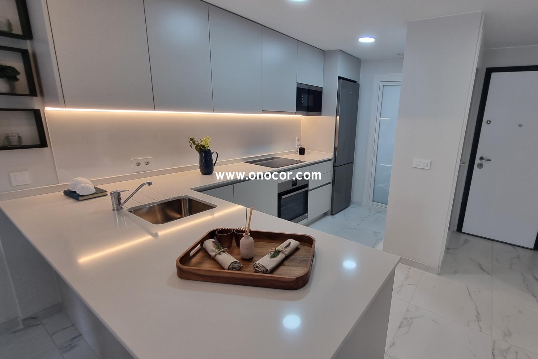 The apartment is on the ground floor and is accessed via a private entrance or from the terrace. Inside there is a spacious lounge/diner with access to a 40m2 terrace with uninterrupted views of the pool area, an open plan kitchen, utility room, three bedrooms and two bathrooms plus a utility room. The master bedroom has an en-suite bathroom.