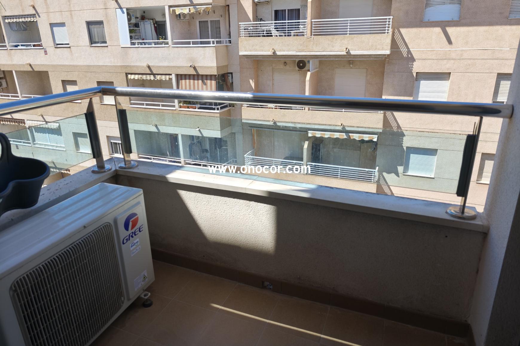 Bright, modern apartment on the fourth floor of a residential building in a quiet side street in the heart of Torrevieja. The property offers 2 bedrooms, 2 bathrooms, a spacious bright living room and a small balcony. Air conditioning included, partly furnished.