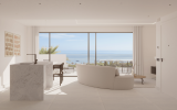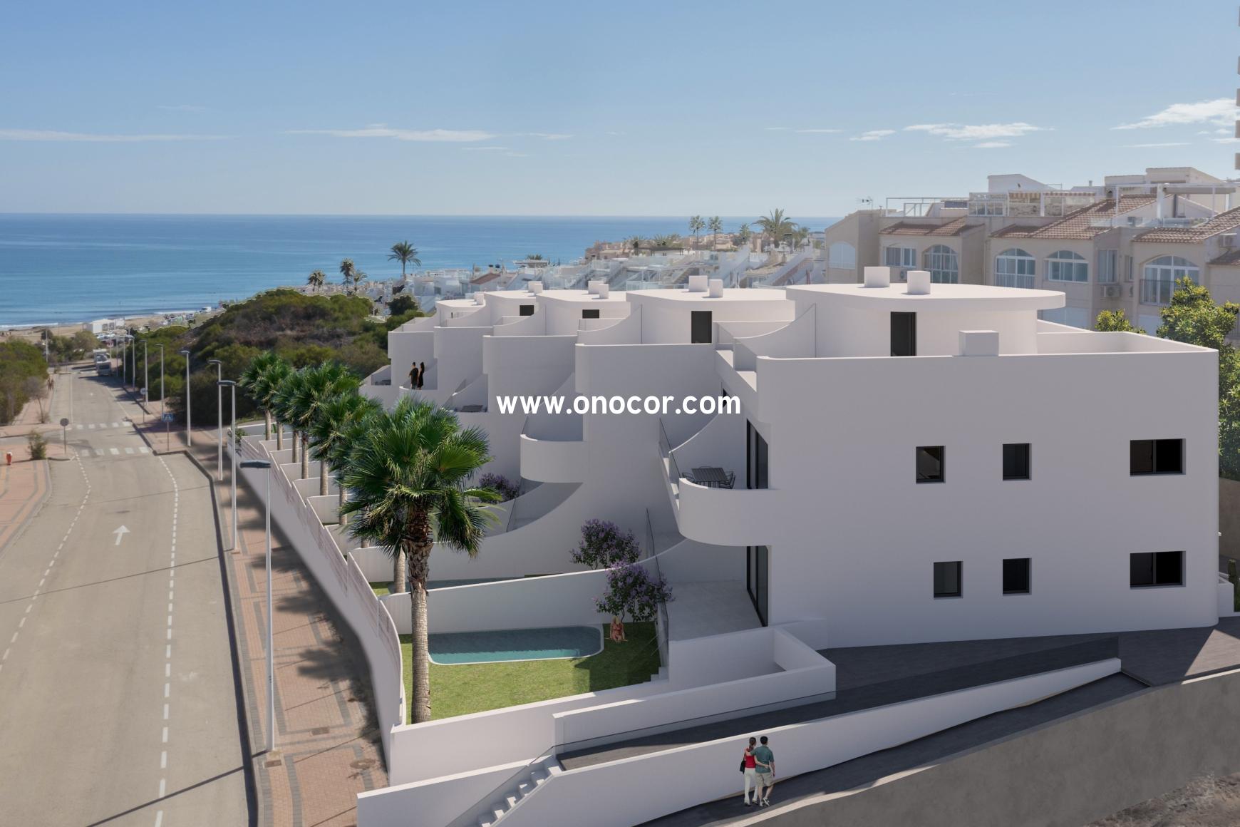 This modern penthouse is located in an exclusive residential complex in the quiet coastal town of La Mata in the south of Alicante. The complex has a communal pool and impresses with its modern and well-kept ambience. The flat extends over the upper floor and can be reached via a private entrance on the ground floor and a staircase. Inside, there is a spacious living and dining area with an open-plan kitchen and access to a large terrace overlooking the bay of La Mata, two bedrooms and two bathrooms as well as a separate study. The master bedroom has an en suite bathroom. An internal staircase leads to the 62 m2 roof terrace. All bedrooms and the living room are air-conditioned. A private parking space is also included in the offer.