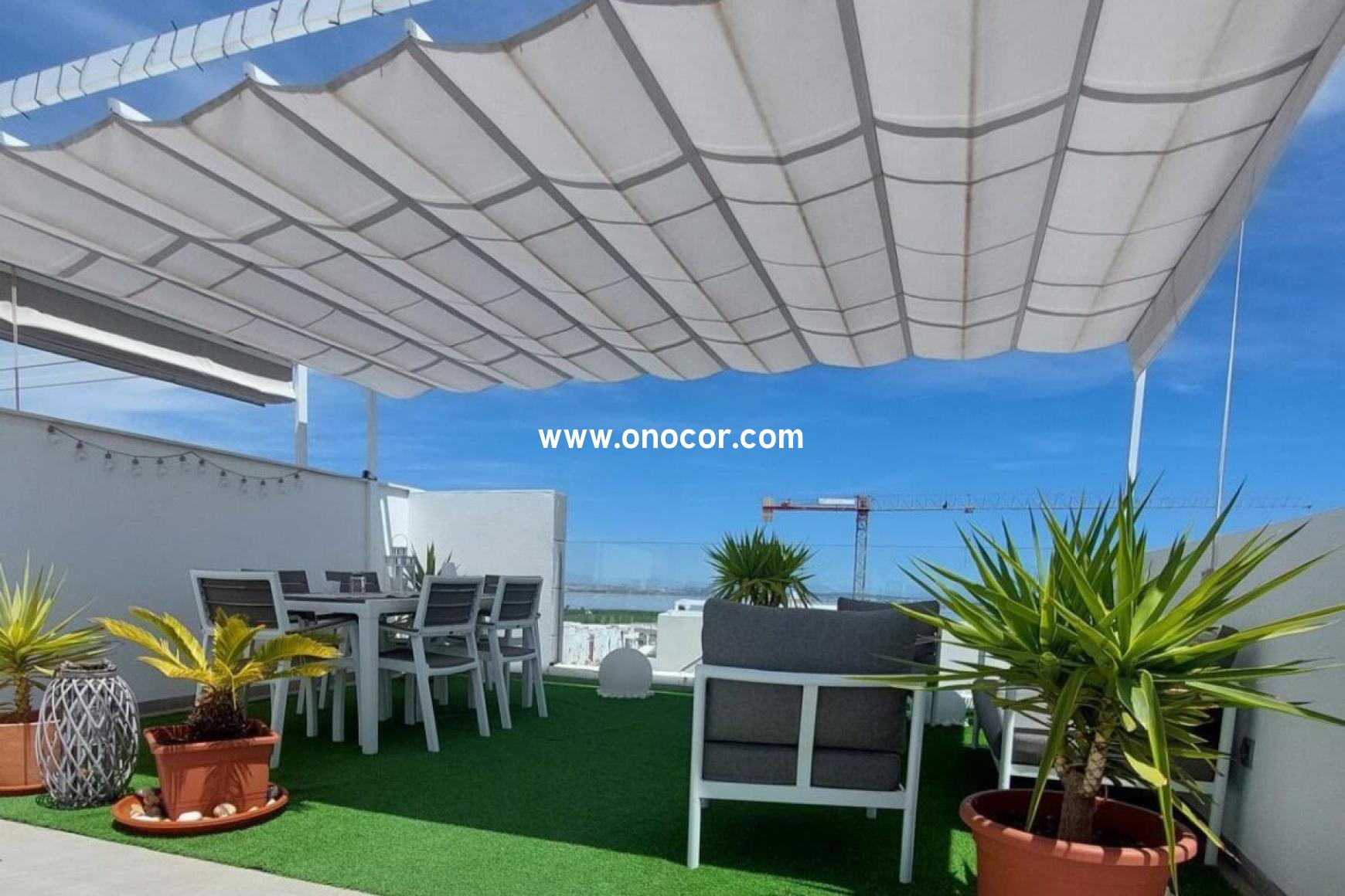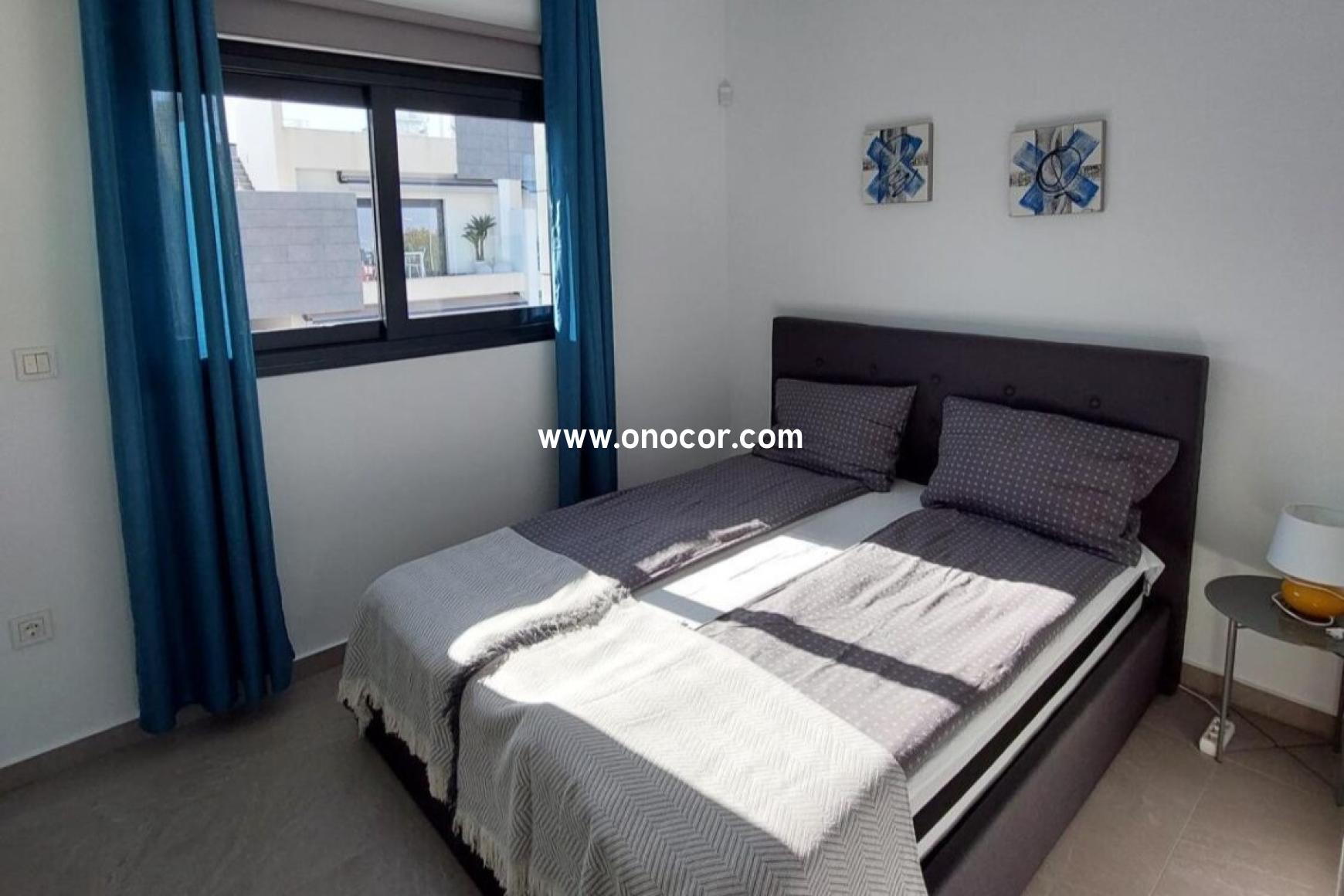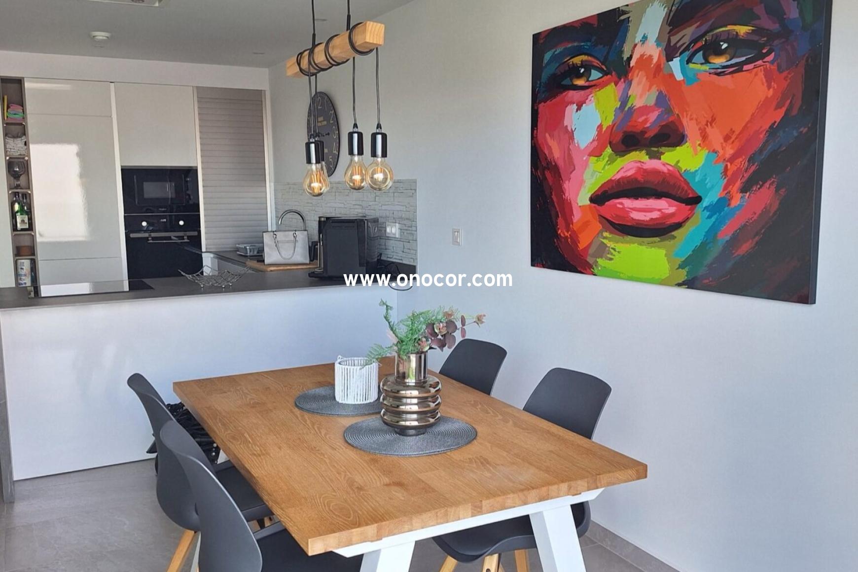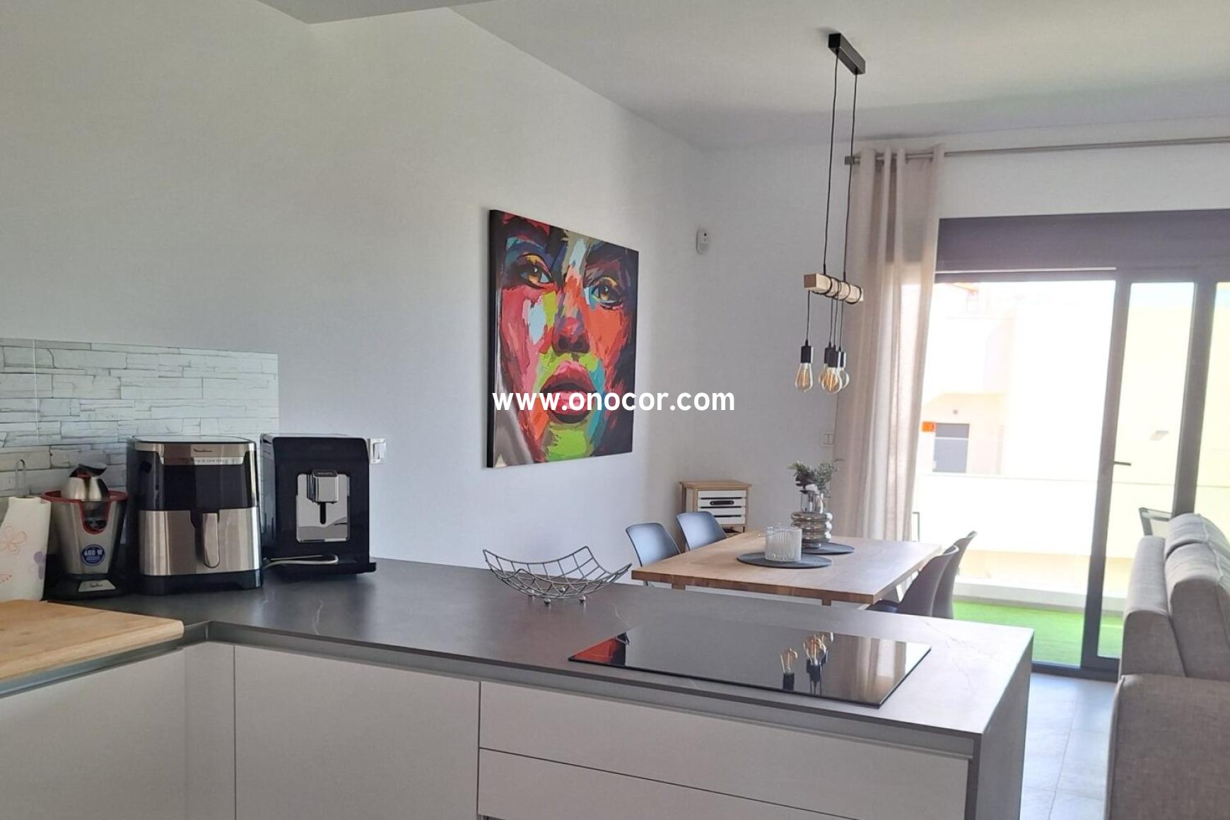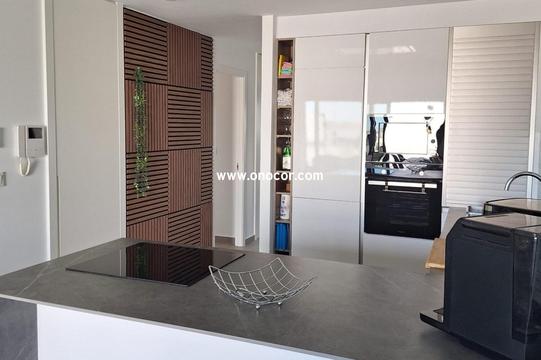 This modern top-floor apartment, built in 2022 in Los Balcones, is located in a gated urbanization on a slightly elevated site. It offers 78 sqm of living space with 2 bedrooms, 2 bathrooms, an open-plan kitchen, and an 8 sqm balcony.