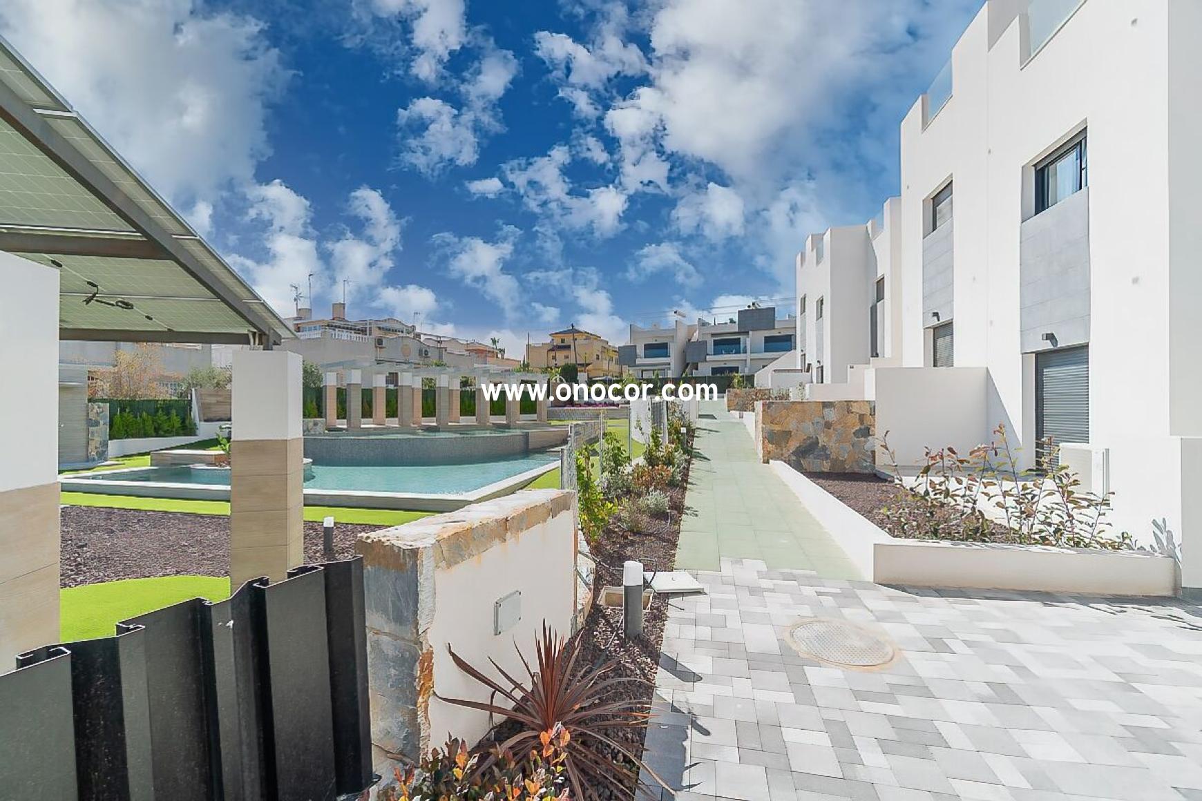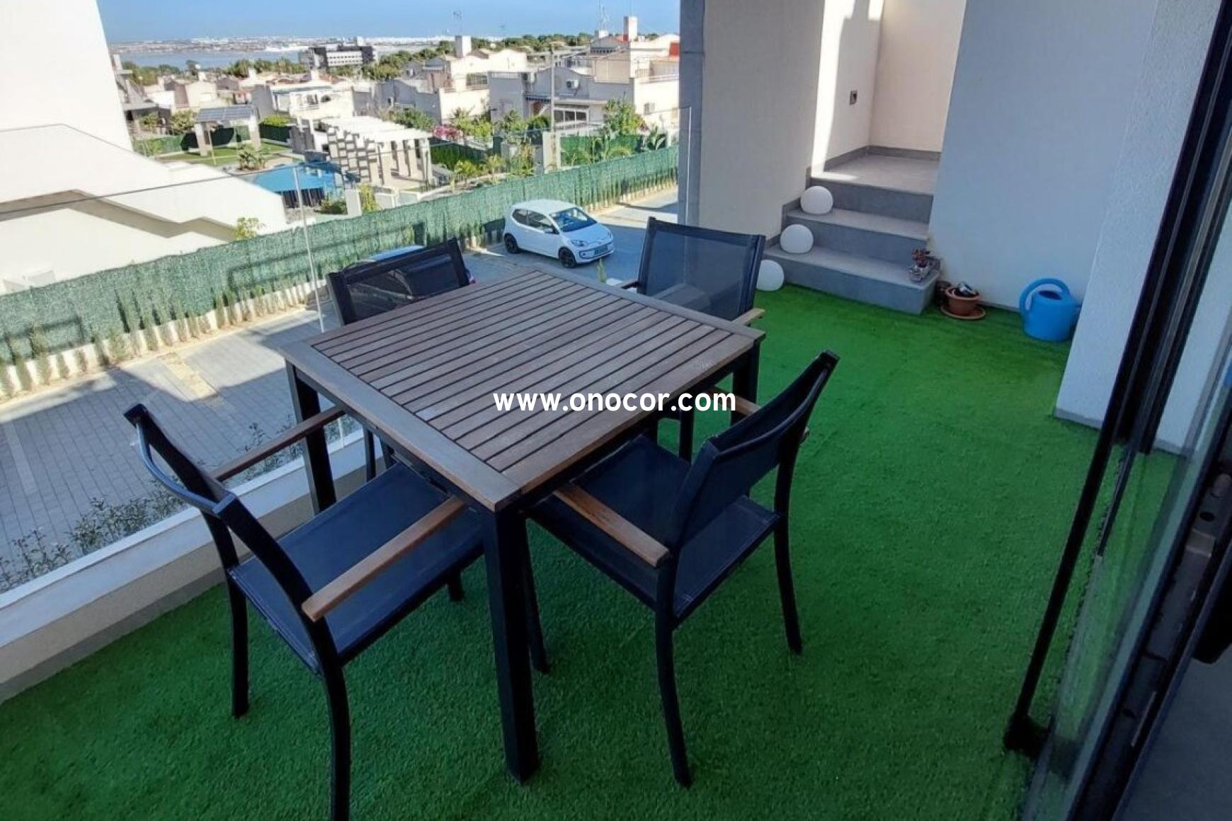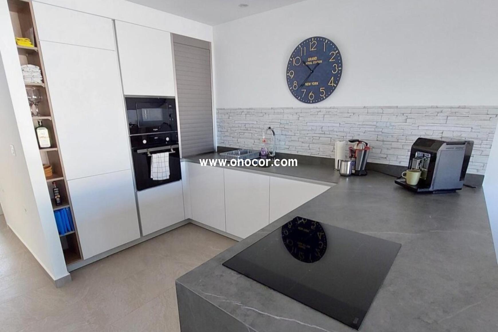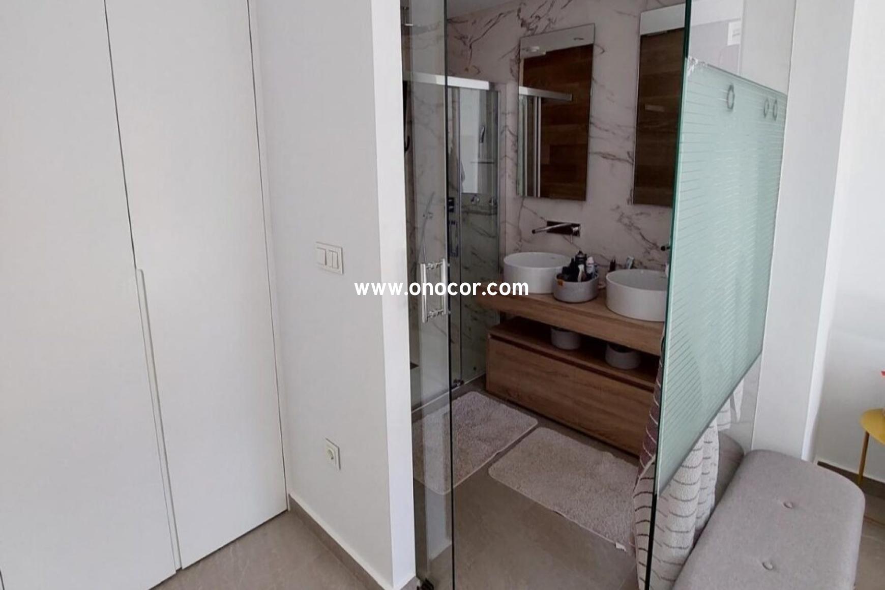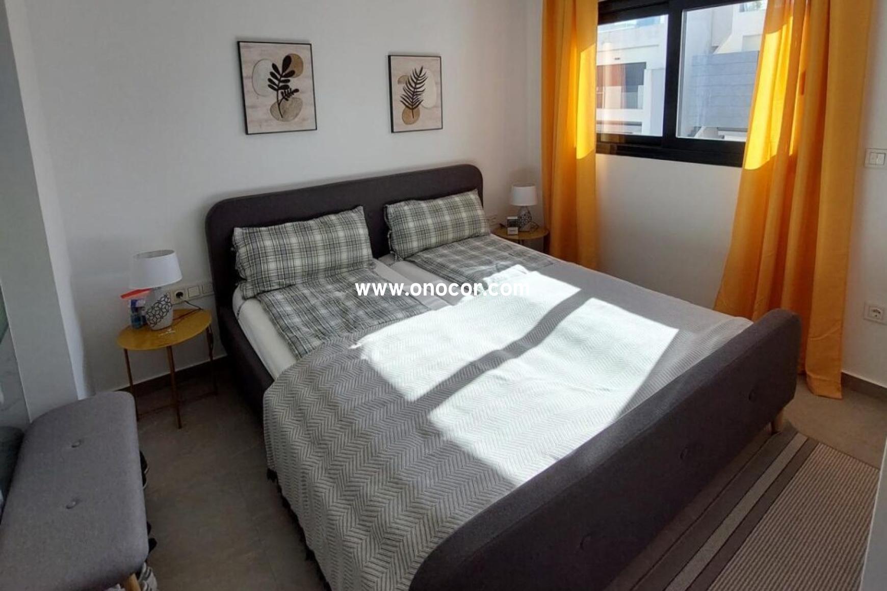 This modern top-floor apartment, built in 2022 in Los Balcones, is located in a gated urbanization on a slightly elevated site. It offers 78 sqm of living space with 2 bedrooms, 2 bathrooms, an open-plan kitchen, and an 8 sqm balcony.