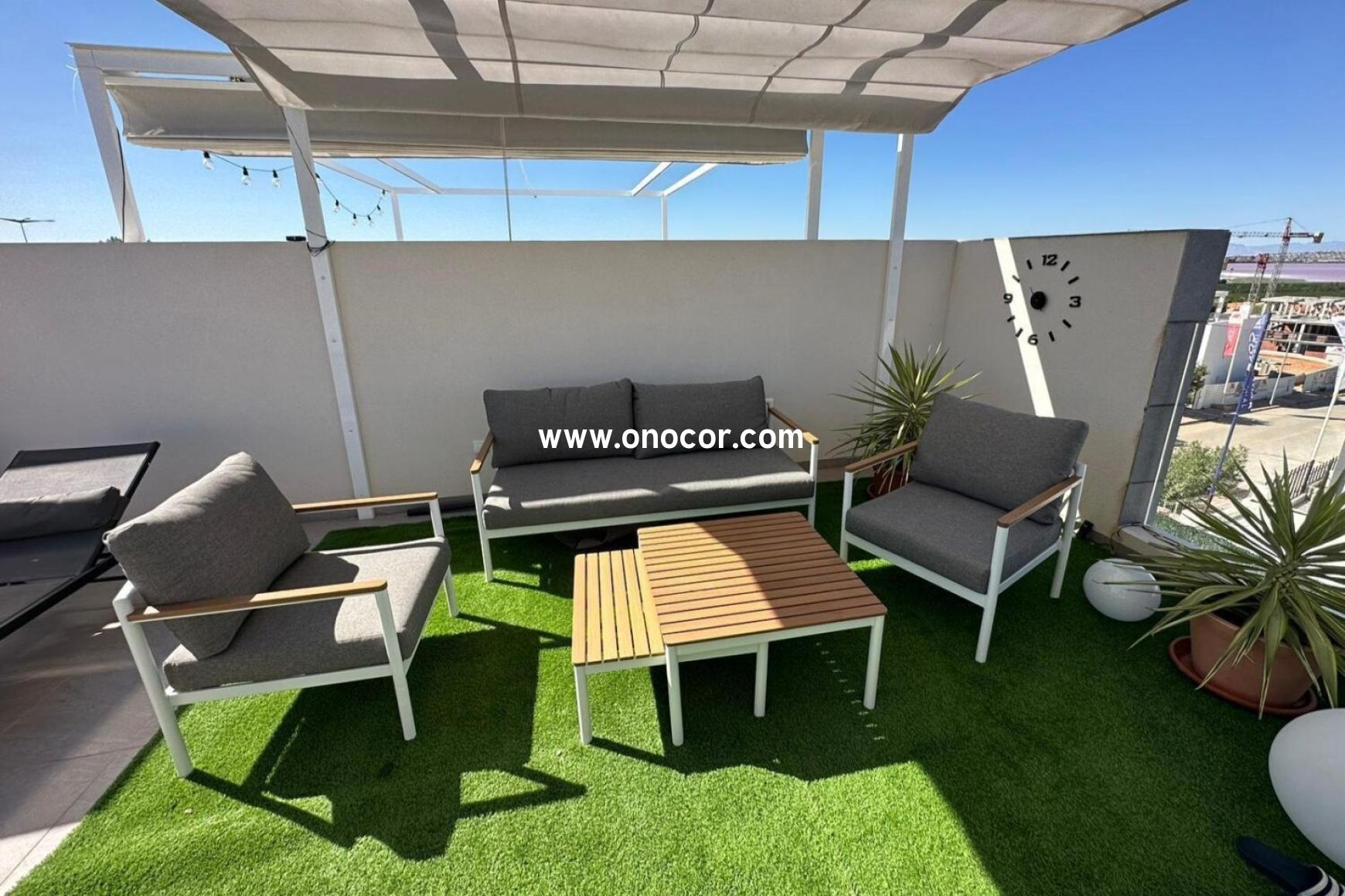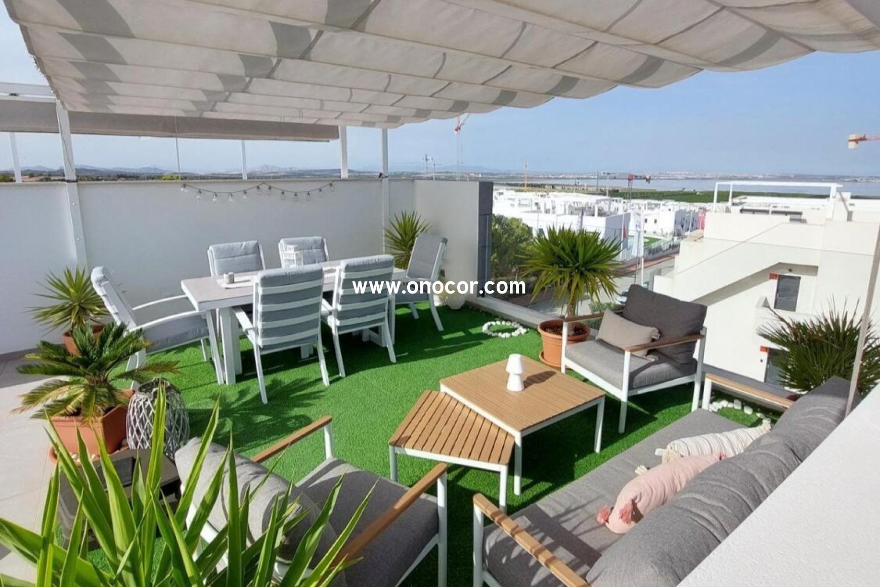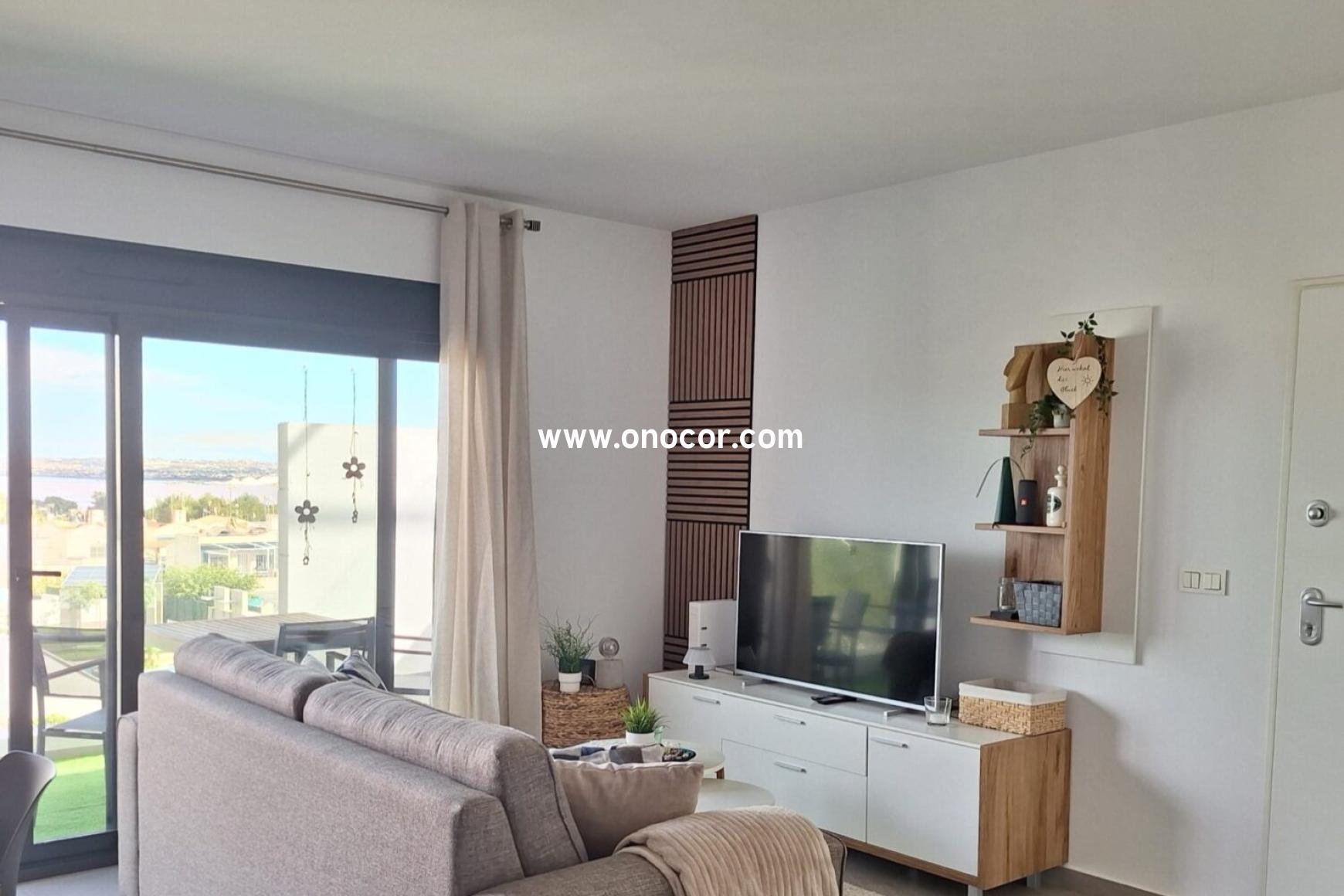 From the apartment and its large private rooftop terrace, you can enjoy breathtaking views over the pool area, the surrounding mountains, and the salt lake. The urbanization elegantly combines Mediterranean charm with modern architecture. Supermarkets, bars, and restaurants are within walking distance. Three communal pools, well-maintained green areas, a gated entrance, and private parking complete the offer. The apartment is sold partly furnished.