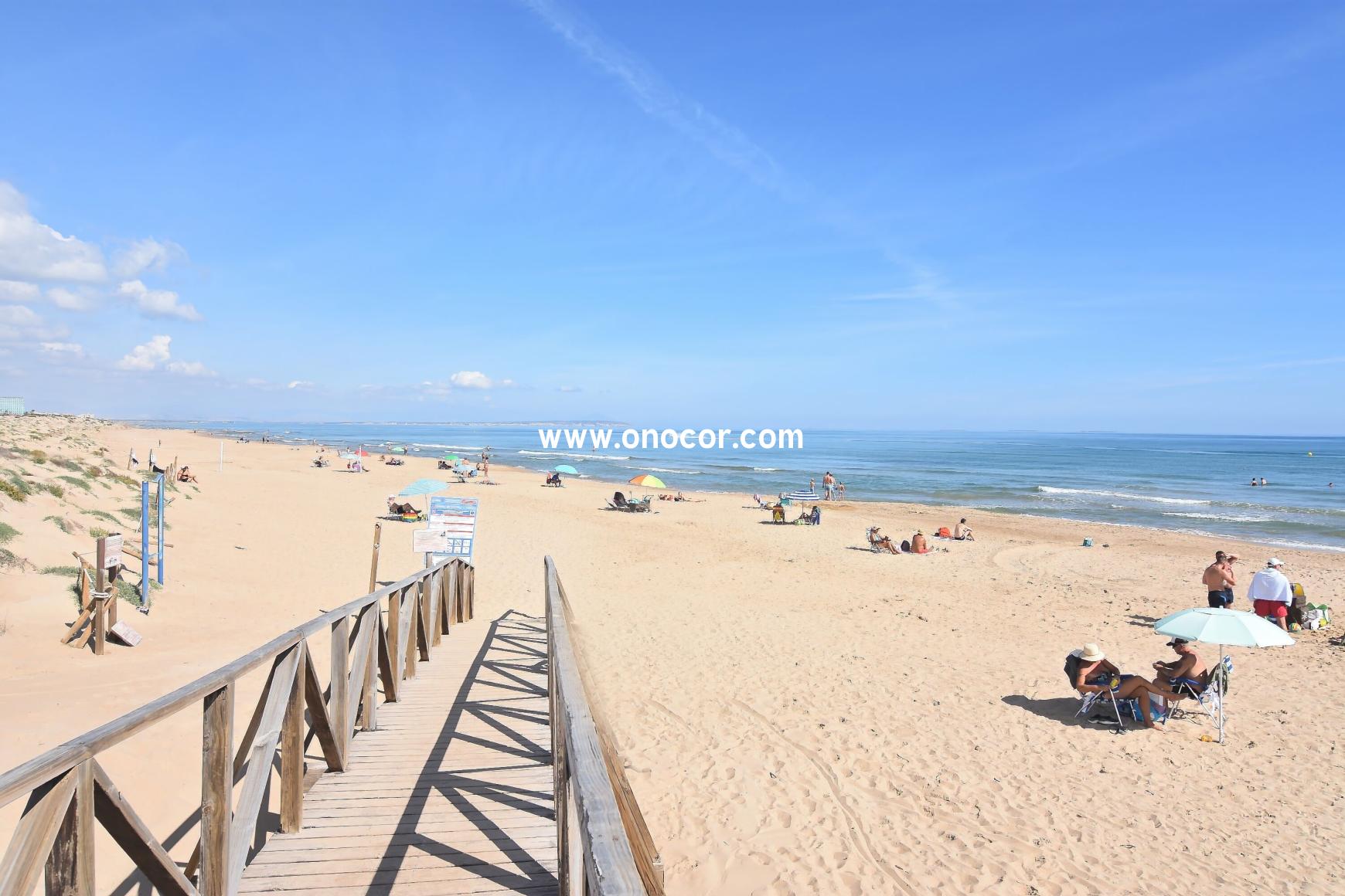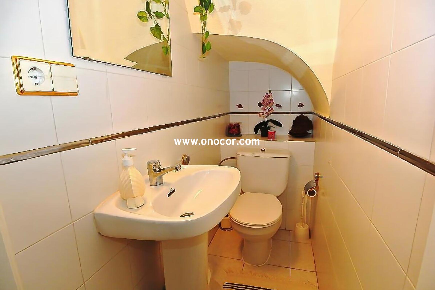 Upstairs, there are three bright bedrooms, one with a balcony, and a bathroom. A large rooftop terrace provides additional space to relax and enjoy the sun. The location is particularly noteworthy: the fine sandy beach of Guardamar del Segura is just a ten-minute walk away along a picturesque path through the pine forest – offering the perfect combination of Mediterranean lifestyle, nature, and comfort.
