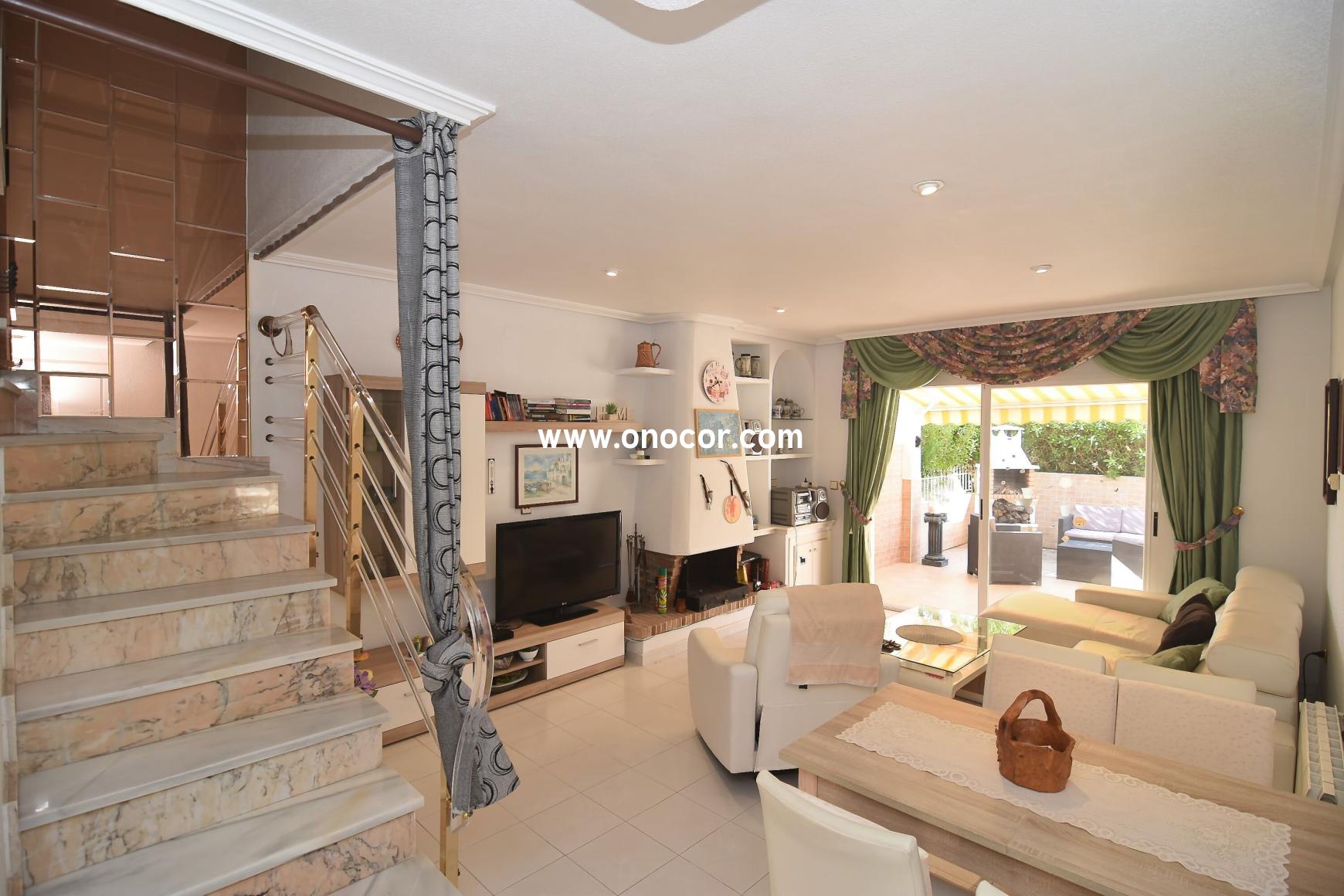 Located in the sought-after residential complex El Moncayo in Guardamar del Segura, this charming townhouse exudes Mediterranean flair. It features a spacious garage, a guest toilet, a separate kitchen with a cozy breakfast terrace, and a living room with a fireplace that opens directly onto the sun terrace with BBQ. From here, you can access the communal garden and the inviting swimming pool.